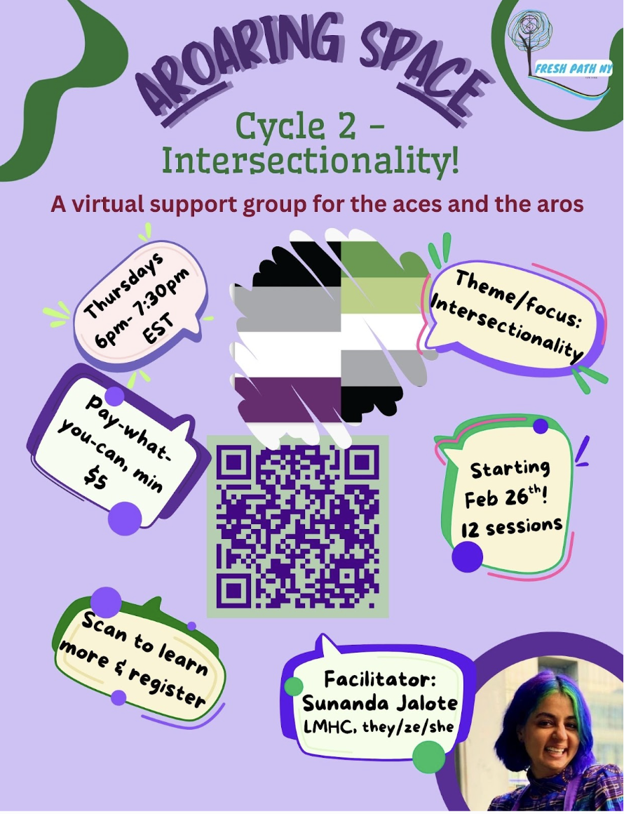 Aroaring Space is a group for people who identify on the asexual and/or aromantic spectrum. While this group will be facilitated by a Licensed Mental Health Counselor, Sunanda, it will primarily function as a support group with a theme: intersectionality.